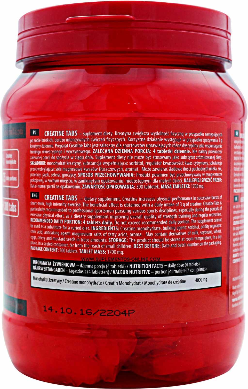 Kreatín tabs sú tablety s mikronizovaným kreatín monohydrátom, ktorý zásobuje svaly energiou, zvyšuje dostupnosť ATP, a tým podporuje rast svalovej hmoty, lepšiu regeneráciu a obnovu energie. Stimuluje anabolické procesy, zlepšuje vývoj sily a odolnosti svalov. Jedna tableta obsahuje 1000 mg kreatín monohydrátu.
