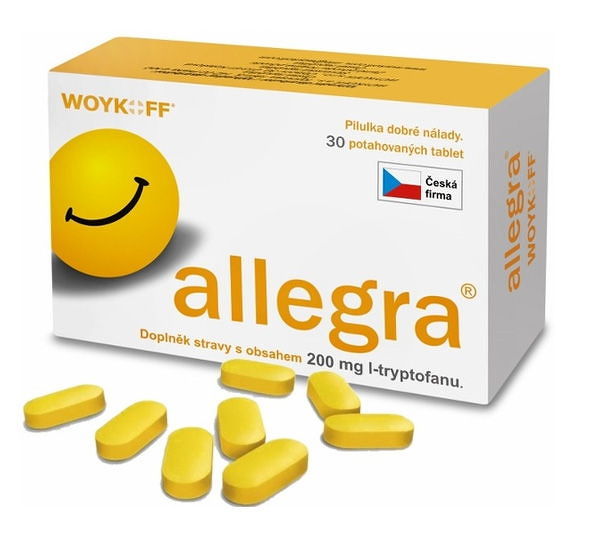 Allegra COMFORT 30 tabliet allegra COMFORT je výživový doplnok s obsahom unikátnej kombinácie esenciálnej aminokyseliny l-tryptofan, ktorá je jediným prekurzorom neurohormónov dobrej nálady serotonínu, melatonínu a vitamínu B6, ktorý prispieva k normálnej psychickej činnosti, zníženiu miery stresu, únavy a vyčerpania a zároveň zvyšuje biologickú dostupnosť l-tryptofanu v neurónoch. Prípravok tiež obsahuje malé množstvo sacharózy (166 mg v jednej tablete), ktorá prispieva k výrazne rýchlejšiemu transportu l-tryptofanu cez hematoencefalickú bariéru a tým k zosilneniu účinku a rýchlejšiemu nástupu účinku.