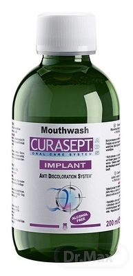 Curasept ADS IMPLANT je účinný prostriedok proti povlaku s 0,2% chlórhexidínu a patentovaným ADS systémom, ktorý chráni prirodzene biele zuby (zabraňuje pigmentácii a poruchám chuti spôsobeným chlórhexidínom). Obsahuje tiež inovatívny kopolymér PVP-VA a kyselinu hyalurónovú. Kombinácia týchto dvoch látok tvorí na sliznici ďasien ochranný film a pomáha v priebehu regenerácie tkaniva. Odporúča sa pri zavádzaní implantátov, po komplikovanej extrakcii zuba či iných chirurgických zákrokoch v ústach, pri zápale ďasien a parodontu a vo všetkých prípadoch, keď je rýchlejšie hojenie rán podmienkou optimálneho výsledku stomatologického zákroku. Spôsob použitiaÚstna voda sa použije po bežnej ústnej hygiene vyplachovaním ústnej dutiny 10 ml neriedeného roztoku (jedna polievková lyžica) minimálne po dobu jednej minúty. Upozornenie: Nejedzte, nepite, nefajčite a nevyplachujte ústa aspoň pol hodinu po použití ústnej vody. Používajte 7 až 14 dní alebo podľa pokynov zubného lekára. Ústnu vodu neprehĺtať, určená je k vonkajšiemu použitiu. Uchovávať mimo dosahu detí. Skladovať v chlade a chráňiť pred zdrojmi svetla. Obal likvidujte v súlade s miestnymi požiadavkami. Nepoužívajte po uplynutí doby použiteľnosti uvedenej na obale. Nepoužívajte, ak je obal poškodený. Obsahuje disiričitan sodný.