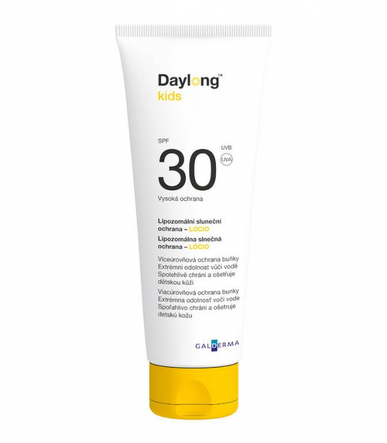 Daylong™ kids SPF 30 je lipozomálne lócio (opaľovacie mlieko) určené špeciálne pre deti. Látky ako dexpanthenol a glycerín hydratujú jemnú detskú kožu. Pre nerušený zážitok z plávania je lócio vybavené extrémnou odolnosťou voči sladkej i slanej vode. Vďaka širokospektrálnej UVA a UVB ochrane poskytuje Daylong™ Kids SPF 30 lócio spoľahlivú slnečnú ochranu pre detskú kožu. vysoká ochrana (SPF 30) extrémne odolné voči vode ošetruje kožu dexpanthenolom, glycerínom, Aloe vera a vitamínom E pre deti od cca. 1 roku bez parfumu, PEG emulgátorov a prídavných konzervačných látok vhodné pre atopickú kožu Nanášajte na kožu v dostatočnom množstve asi 20 minút pred pobytom na slnku a nechajte prípravok dobre vstrebať. Zabráňte kontaktu s očami. Pri nadmernom potení, plávaní a sušení nanášanie prípravku zopakujte. Zníženie požadovaného množstva značne zníži úroveň ochrany. Nadmerné slnenie vážne ohrozuje zdravie. Ani prípravky s vysokým SPF neposkytujú absolútnu ochranu pred UV žiarením. Dojčatá a malé deti nevystavujte priamemu slnečnému žiareniu. Prípravky slnečnej ochrany môžu spôsobiť zafarbenie textílií a iných materiálov.