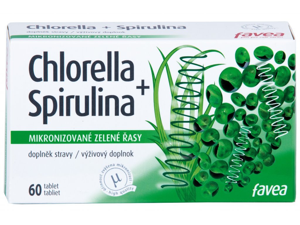 Favea Chlorella + spirulina 60 tabliet Obsahuje sušenú a mikronizovanú biomasu sladkovodnej riasy Chlorella pyrenoidosa a riasu Spirulina.