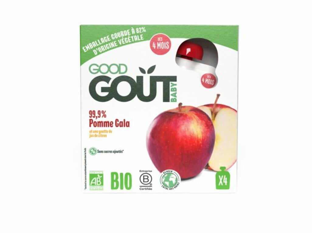 Good Gout Jablko BIO 4x85 g Desiata v praktickom balení, ktorú môžete mať stále po ruke. Z bio surovín a bez obsahu alergénov. Príprava: Dobre pretrepte a otočte viečko. Podávajte priamo z vrecka. Alebo na lyžičke. Zloženie: Bio jablká Gala 99,9%, koncentrát šťavy z bio aceroly. Lahodná ovocná desiata z bio surovín bez laktózy a lepku av praktickom balení. Vhodná pre deti už od 4. mesiacov.