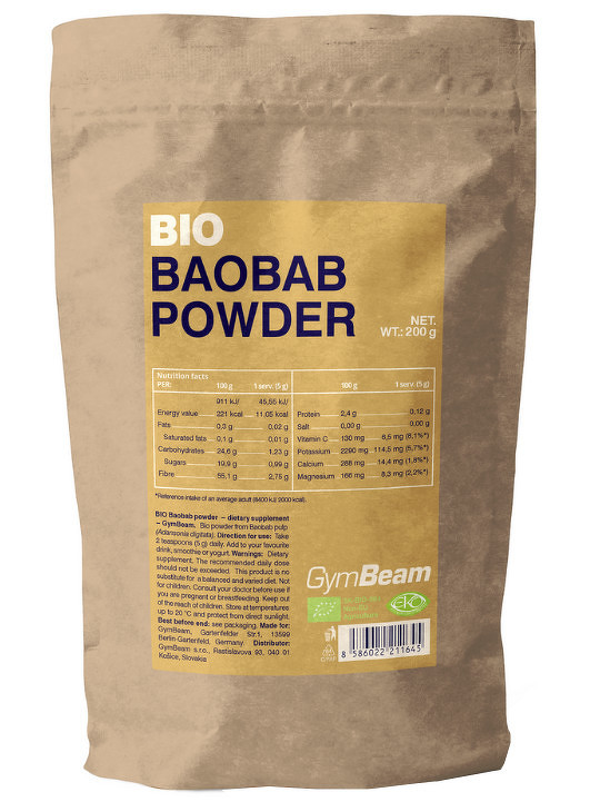 GymBeam BIO Baobab prášok 200 g Prášok si zachováva všetky dôležité živiny, ktoré Baobab ponúka, ako je vláknina, vitamín C, draslík, vápnik a horčík. Potravinu budúcnosti si môžete vychutnať ako súčasť svojich obľúbených nápojov, ale nutrične obohatí aj vaše raňajkové kaše či iné jedlá.