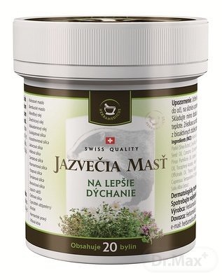 Prípravok obsahuje zmes 20 bylinných výťažkov v BIO kokosovom masle. Jazvečia masť je vhodná na potieranie a masáž v oblasti hrudníka, krku, zátylku, chrbta, čela a spánkov.