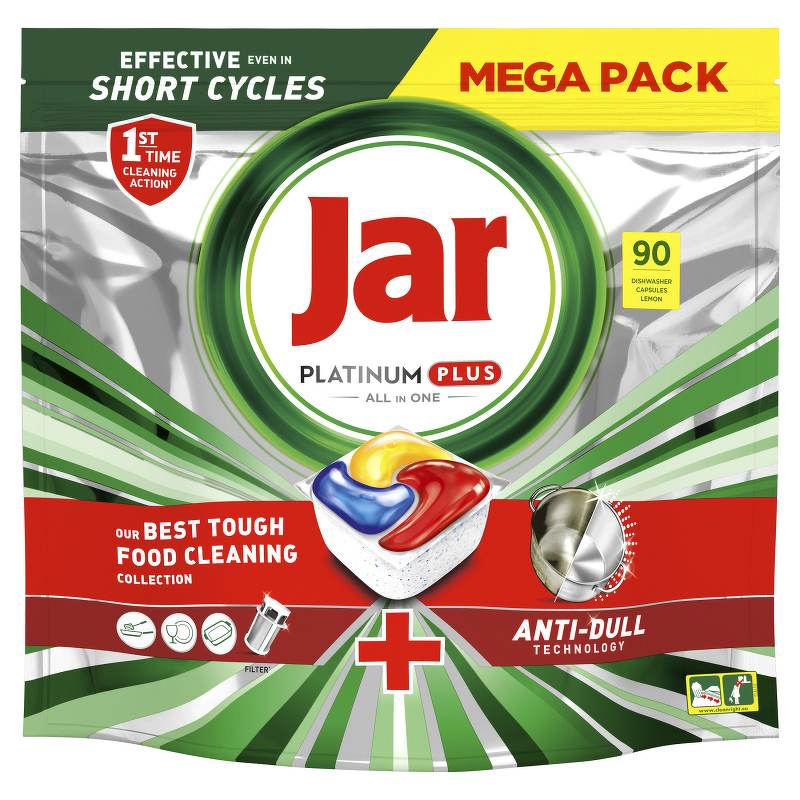 Najlepší prostriedok z kolekcie Jar na umývanie odolných zvyškov jedla, ktorý zanecháva vaše riady čisté ako nové Vďaka technológii Anti-dull odstraňuje matnosť a obnovuje pôvodný lesk vášho riadu Účinné aj pri krátkych cykloch Prepnite na krátke cykly a ušetrite čas, energiu a vodu v porovnaní s bežnými cyklami Vďaka zabudovanému systému predbežného umývania nemusíte riad vopred umývať vy a dokonca vám pomáha šetriť vodu Odporúčané výrobcami umývačiek riadu na celom svete Zabudovaná pomocná funkcia soli a leštidla vrátane ochrany skla a striebra Náš závod využíva a kupuje 100 % obnoviteľnú elektrickú energiu