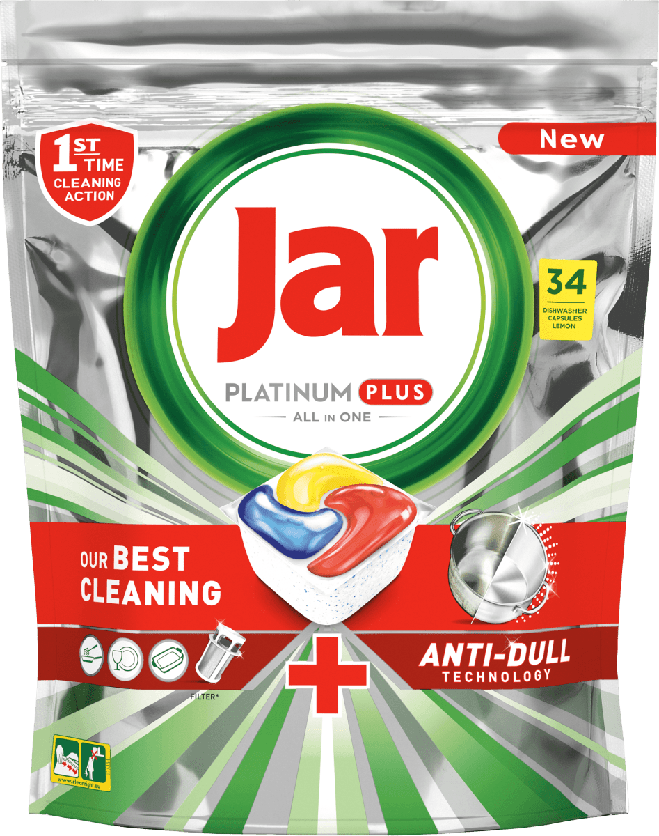 Kapsule Jar Platinum Plus zanechávajú riadu čisté ako nové, zaručujú najlepšie čistiace účinky od Jari a dokonca pomáhajú odstraňovať zašedlosť vznikajúce časom a obnovujú pôvodný lesk riadu.