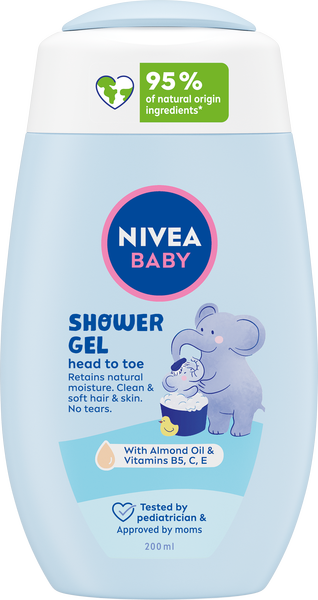 Sprchovací gél jemne umýva citlivú detskú pokožku. Šetrné zloženie so 100 % prírodným mandľovým olejom a vitamínmi B5, C a E zaistí tú správnu starostlivosť. Skúste kúpanie s: NIVEA BABY Sprchovací gél pre celé telo a vlásky.