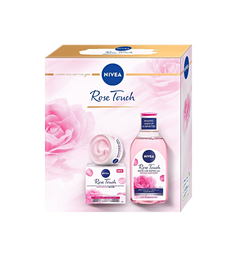 Darčekové balenie obsahuje: Micelárna voda NIVEA Micellar Rose Water 400 ml a pleťový denný krém NIVEA Rose Care Moisturizing Gel Cream 50 ml.