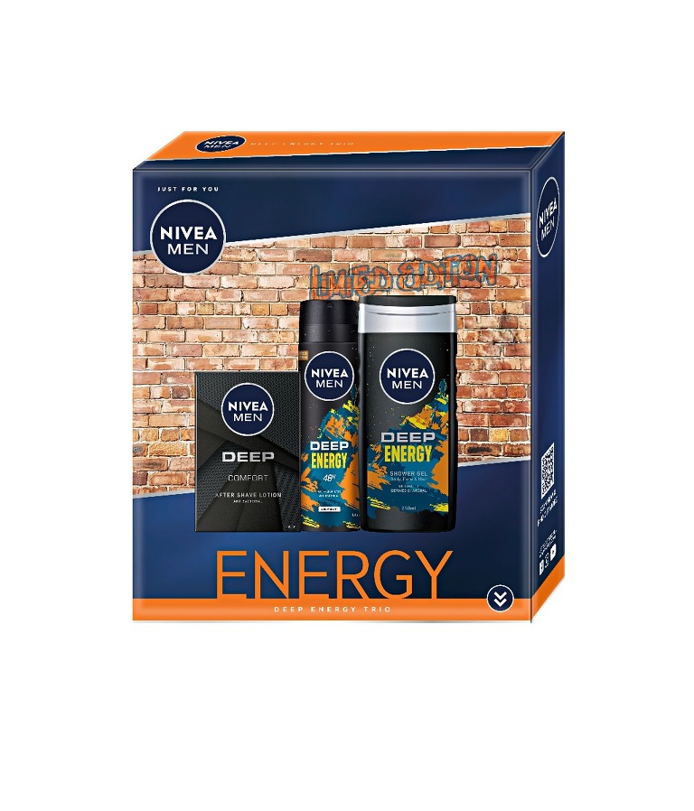 Darčekové balenie obsahuje: Voda po holení Deep 100 ml, Antiperspirant pre mužov Deep Energy 150 ml a sprchovací gél pre mužov Deep Energy 250 ml.