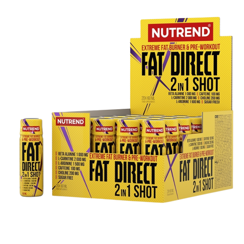 NUTREND Fat Direct Shot 20 x 60 ml FAT DIRECT SHOT je spaľovač a nakopávač 2 v 1. Predstavuje jedinečné spojenie účinných látok na podporu chudnutia a fyzického výkonu. Tento pomocník pre obdobie diétneho režimu a tvrdého tréningu zabezpečuje stimuláciu organizmu, oddiali únavu a súčasne podporuje účinnosť metabolizmu tukov. FAT DIRECT SHOT je bez cukru.
