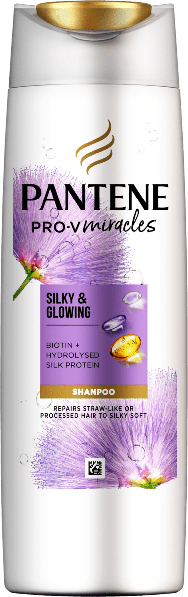 Šampón Pantene Pro-V Silky & Glowing na poškodené vlasy Obnovuje vlasy vyzerajúce ako slama alebo nadmerne upravované vlasy na hodvábne hebké Užívajte si neodolateľne jemné vlasy hodvábne na dotyk Predstavujeme Pantene Pro-V Miracles, našu vysoko výživnú zmes Pro-V na vlasy, ktoré potrebujú zázrak Testované inštitútom Swiss Vitamin Institute