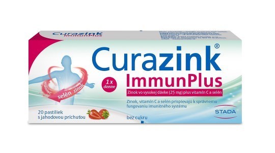 Stada Curazink Immun Plus 20 pastiliek Pastilky s obsahom zinku, selénu a vitamínu C s jahodovou príchuťou.