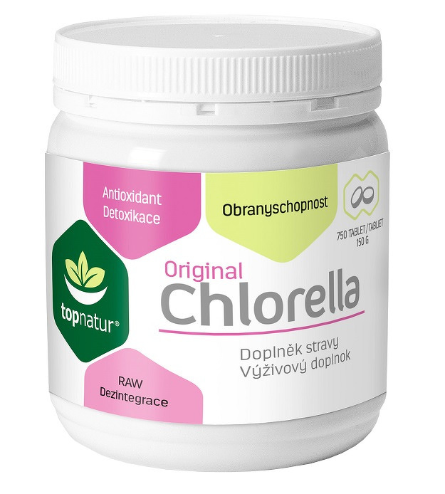 TOPNATUR Chlorella Original 750 tabliet Chlorella Pyrenoidosa je sladkovodná riasa s vysokým obsahom bielkovín, vitamínu A, C, B2, vápnika, horčíka, železa a chlorofylu, je tiež zdrojom vitamínov B6 a B1.