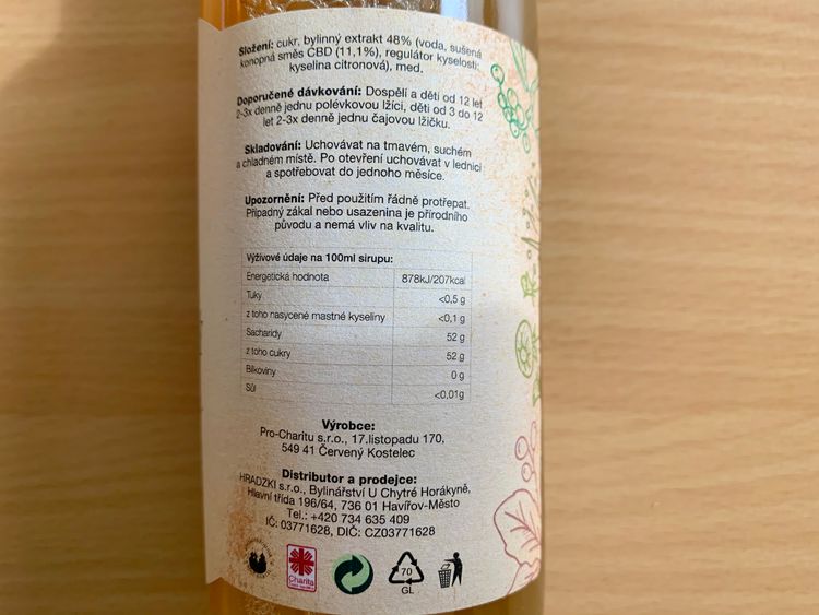 Konopný elixír sa predáva vo fľaške s objemom 250 ml. Etiketa je svojím vzhľadom málo nápadná. Cena Konopného elixíru sa pohybuje okolo 9,50 €. Toto balenie pri optimálnom dávkovaní postačí dospelemú užívateľovi približne na 13 dní, za predpokladu, že bude užívať sirup 2-krát denne.