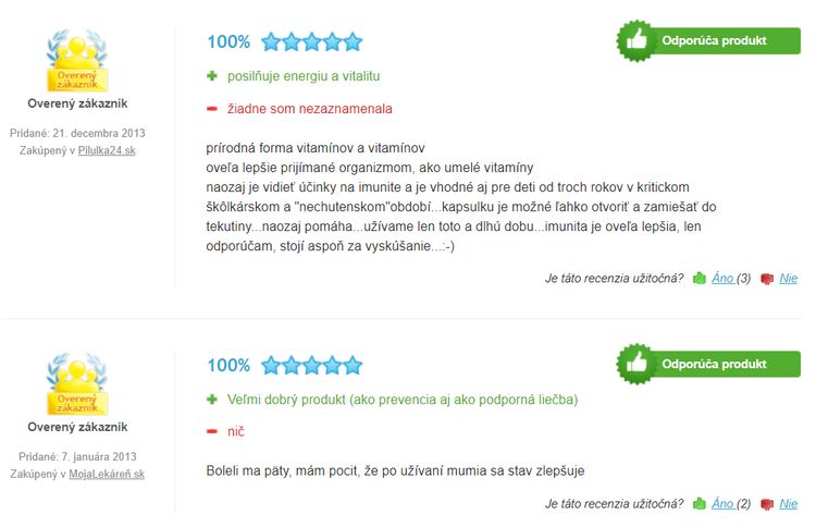 Priemerné hodnotenie Pharma Activ Mumio dosahuje na portáli Heuréka v čase písania recenzie 85 %. Z toho iba 1 zákazník produkt neodporúča, no zároveň uvádza, že z doterajšieho užívania výsledok nevie posúdiť. Zvyšné skúsenosti hovoria v prospech výživového doplnku, a to v súvislosti s posilnením kostí či dokonca imunity.