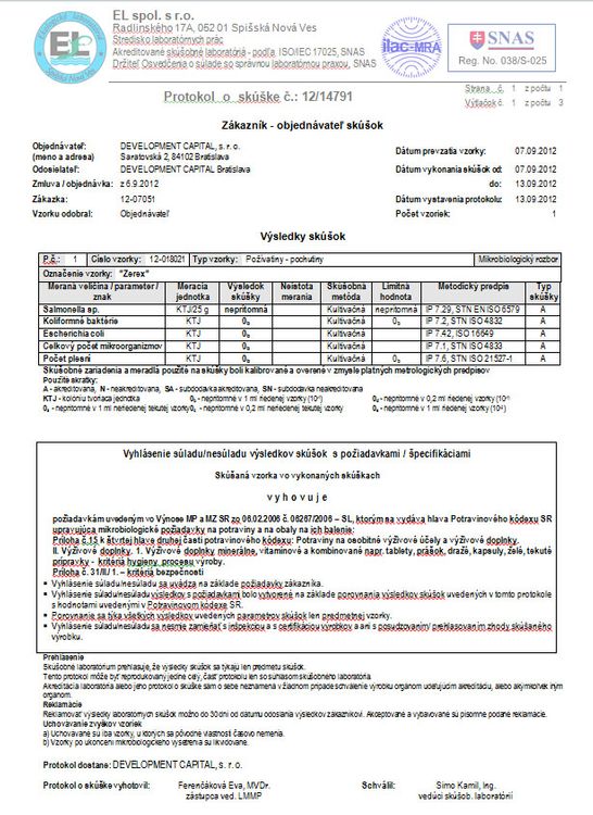 Obe skúšky prebiehali v akreditovanom skúšobnom laboratóriu (Ekologické laboratóriá Spišská Nová Ves) a v oboch testoch Zerex vyhovel.